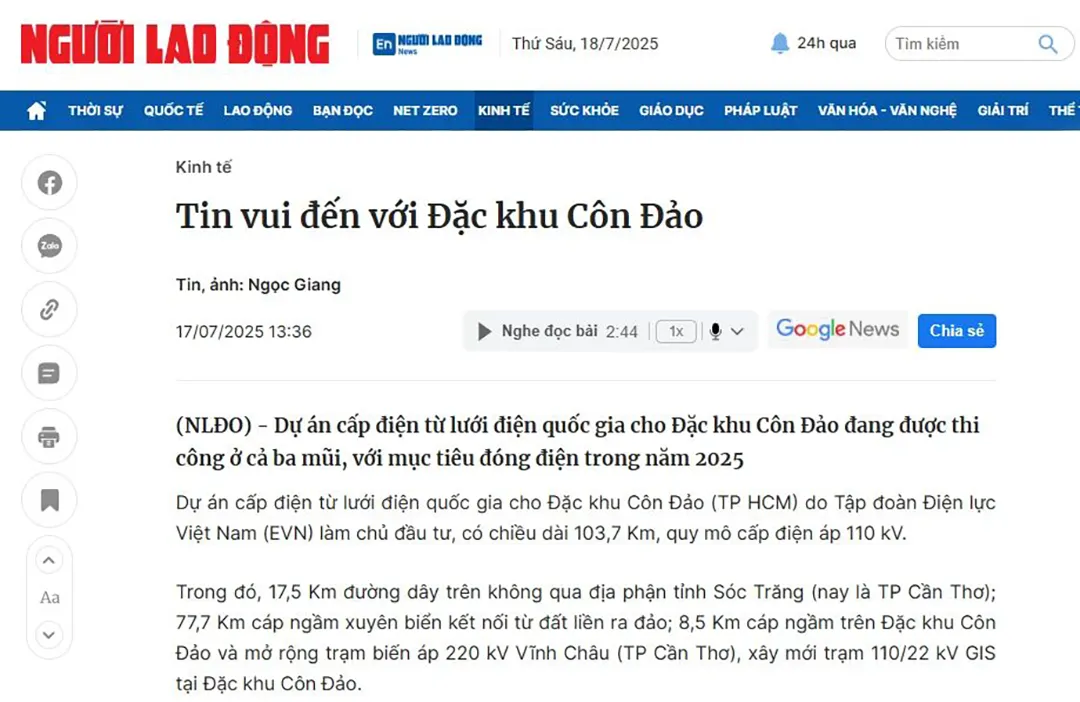 This project is invested and constructed by Vietnam Electricity (EVN), with a total investment of approximately 492.3 billion Vietnamese Dong. The total length of the project is 103.7 kilometers, including: 77.7 kilometers of submarine cable connecting the mainland to the island; 17.5 kilometers of overhead lines crossing Can Tho City; 8.5 kilometers of cables on the island; and the construction and expansion of related substations (Vinh Chau 220kV substation and Con Dao 110/22kV GIS substation).